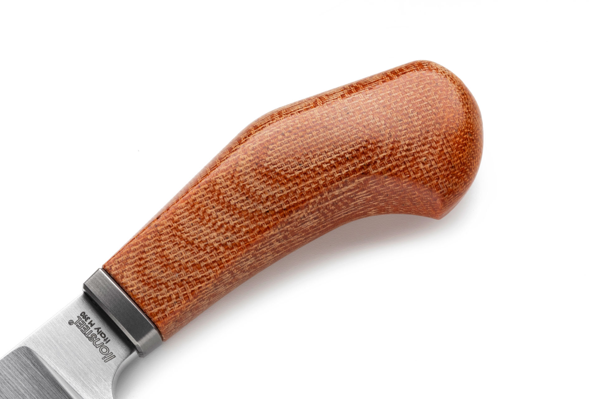 Накладки рукояти ножа изготовлены из Микарты - необычный и очень прочный материал. Слой различных тканей (в основном льняных) заливается специальной смолой и под давлением затвердевает - так получается Микарта. Смола, армированная толстым слоем ткани, получается очень прочной и долговечной, такой материал не боится влаги или больших температур. В руке Микарта ощущается, пожалуй, приятнее всех остальных материалов, но некоторым может показаться слегка скользкой. Имеет просто колоссальный выбор цветов и вариаций, что делает Микарту одним из самых интересных материалов для рукоятей ножей.