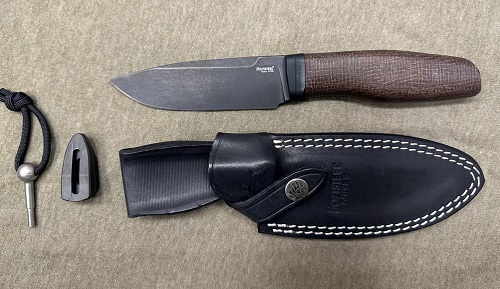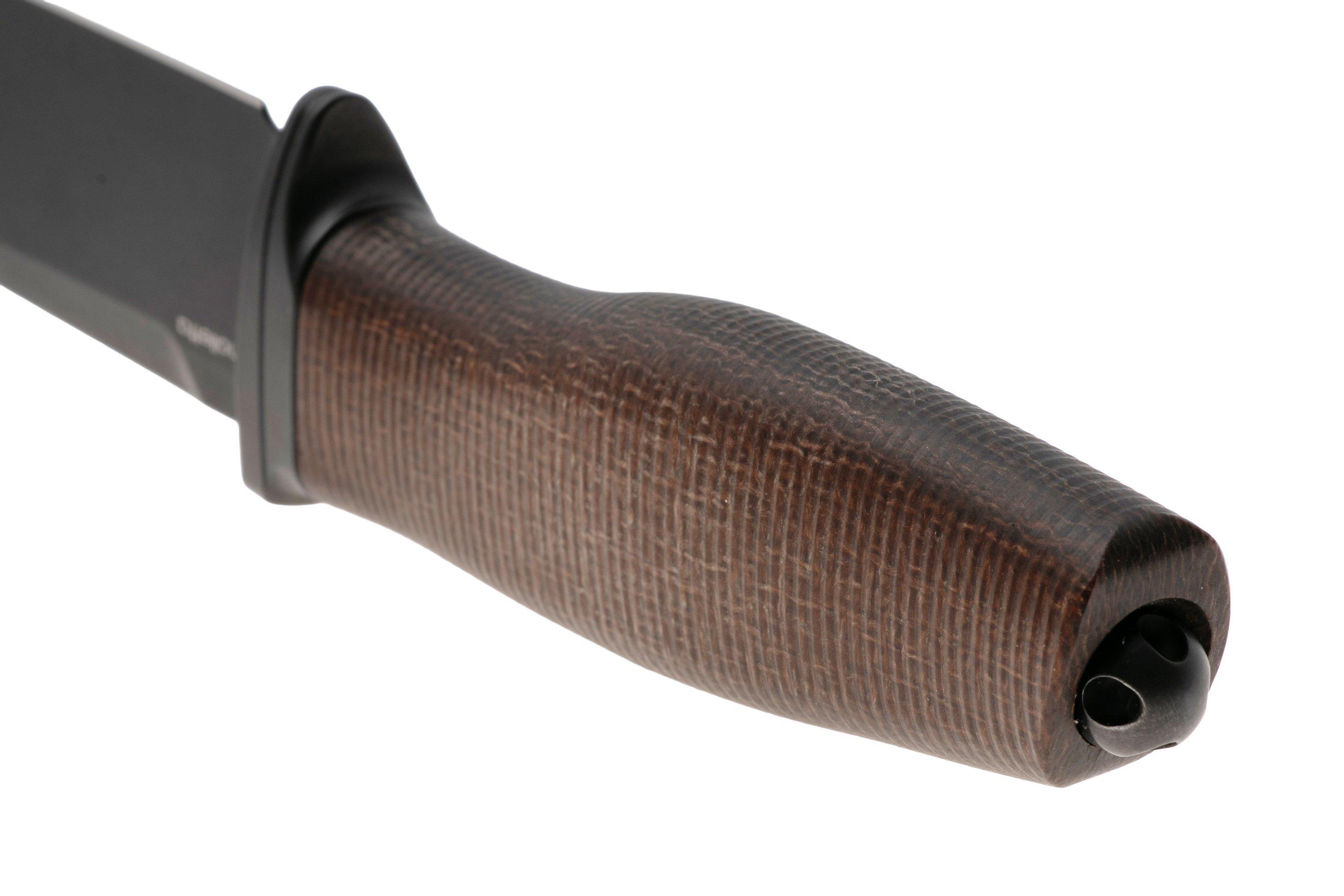 Накладки рукояти ножа изготовлены из Микарты - необычный и очень прочный материал. Слой различных тканей (в основном льняных) заливается специальной смолой и под давлением затвердевает - так получается Микарта. Смола, армированная толстым слоем ткани, получается очень прочной и долговечной, такой материал не боится влаги или больших температур. В руке Микарта ощущается, пожалуй, приятнее всех остальных материалов, но некоторым может показаться слегка скользкой. Имеет просто колоссальный выбор цветов и вариаций, что делает Микарту одним из самых интересных материалов для рукоятей ножей.