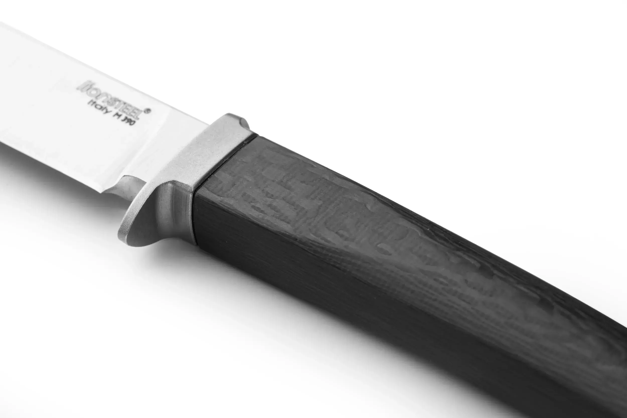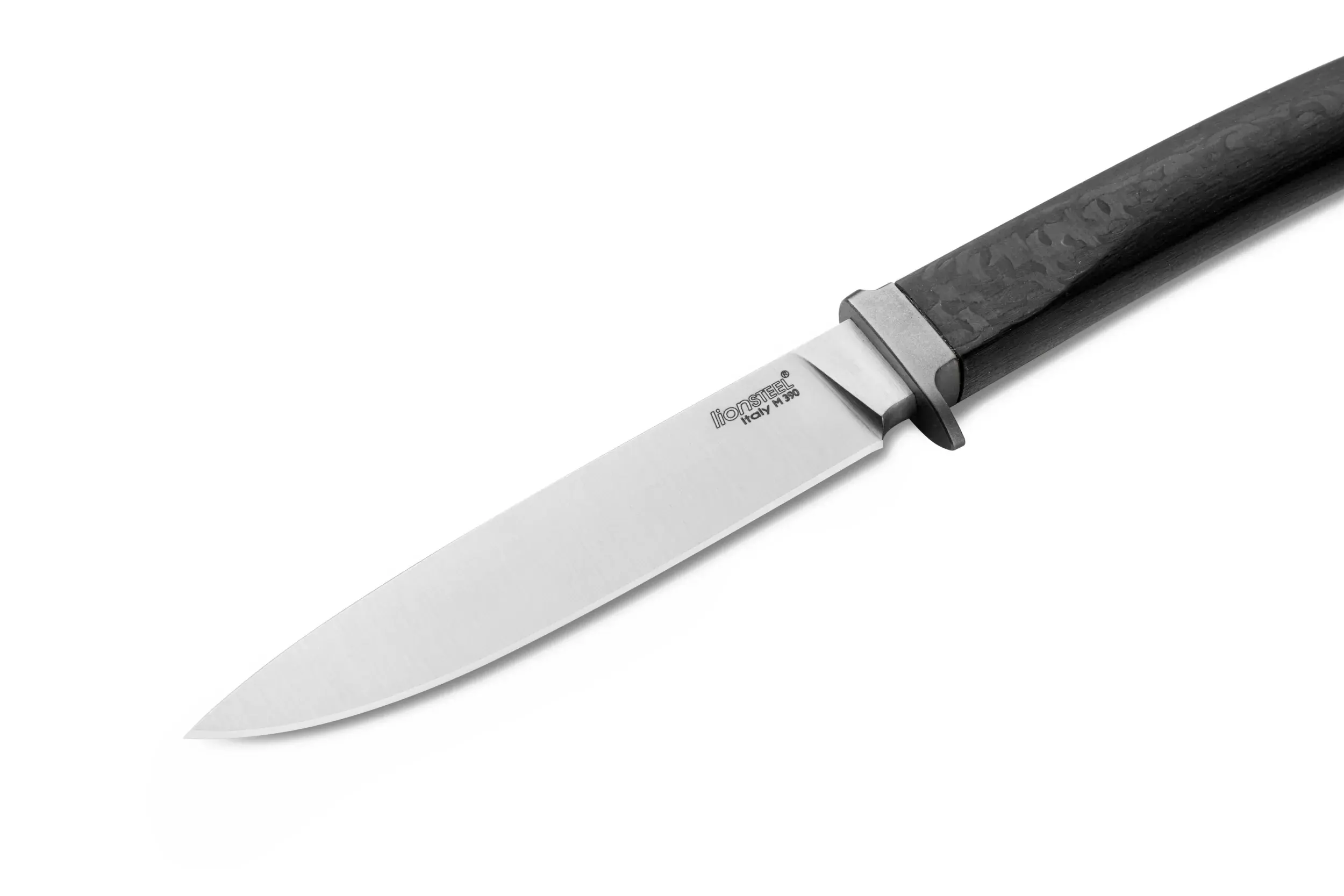 На ноже установлена рукоять из Carbon fiber - нити углерода, залитые смолой в вакууме. Используется как очень прочный и чрезвычайно легкий материал в гоночных болидах. В ножевом мире считается премиум материалом, который также не лишен высоких прочностных характеристик. А различные схемы переплетения тканей углерода придают карбону эстетически разнообразные рисунки. Очевидный минус карбона в его немалой стоимости, которую компенсируют его характеристики и внешняя привлекательность. Carbon fiber не подвержен старению и разрушению от воздействия нагрузок, и больших по значению температур.