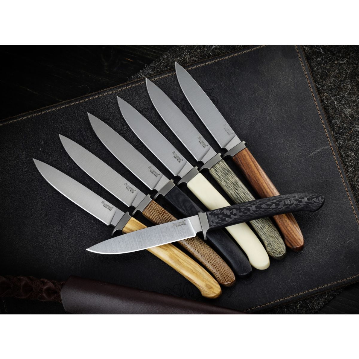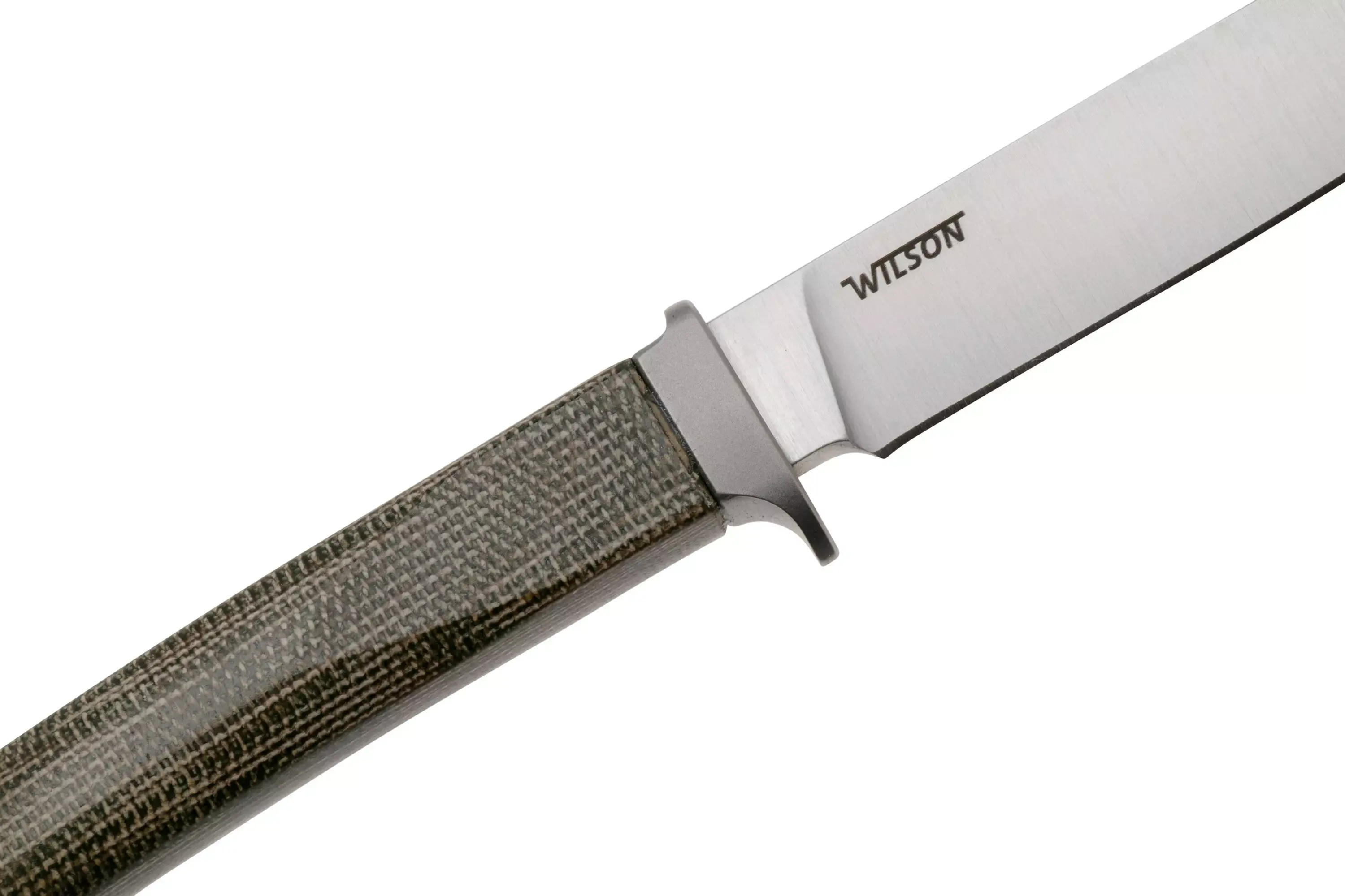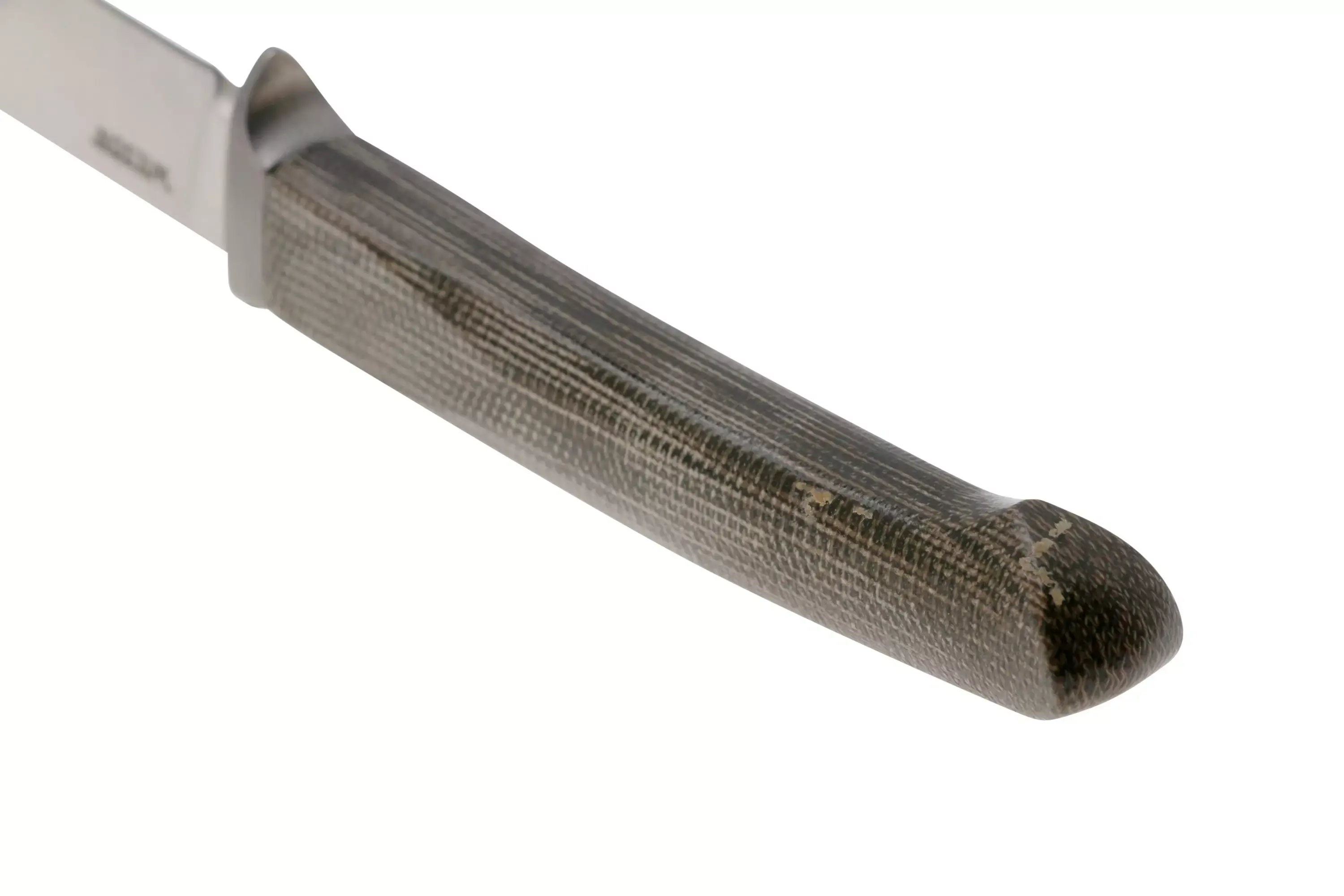 Накладки рукояти ножа изготовлены из Микарты - необычный и очень прочный материал. Слой различных тканей (в основном льняных) заливается специальной смолой и под давлением затвердевает - так получается Микарта. Смола, армированная толстым слоем ткани, получается очень прочной и долговечной, такой материал не боится влаги или больших температур. В руке Микарта ощущается, пожалуй, приятнее всех остальных материалов, но некоторым может показаться слегка скользкой. Имеет просто колоссальный выбор цветов и вариаций, что делает Микарту одним из самых интересных материалов для рукоятей ножей.
