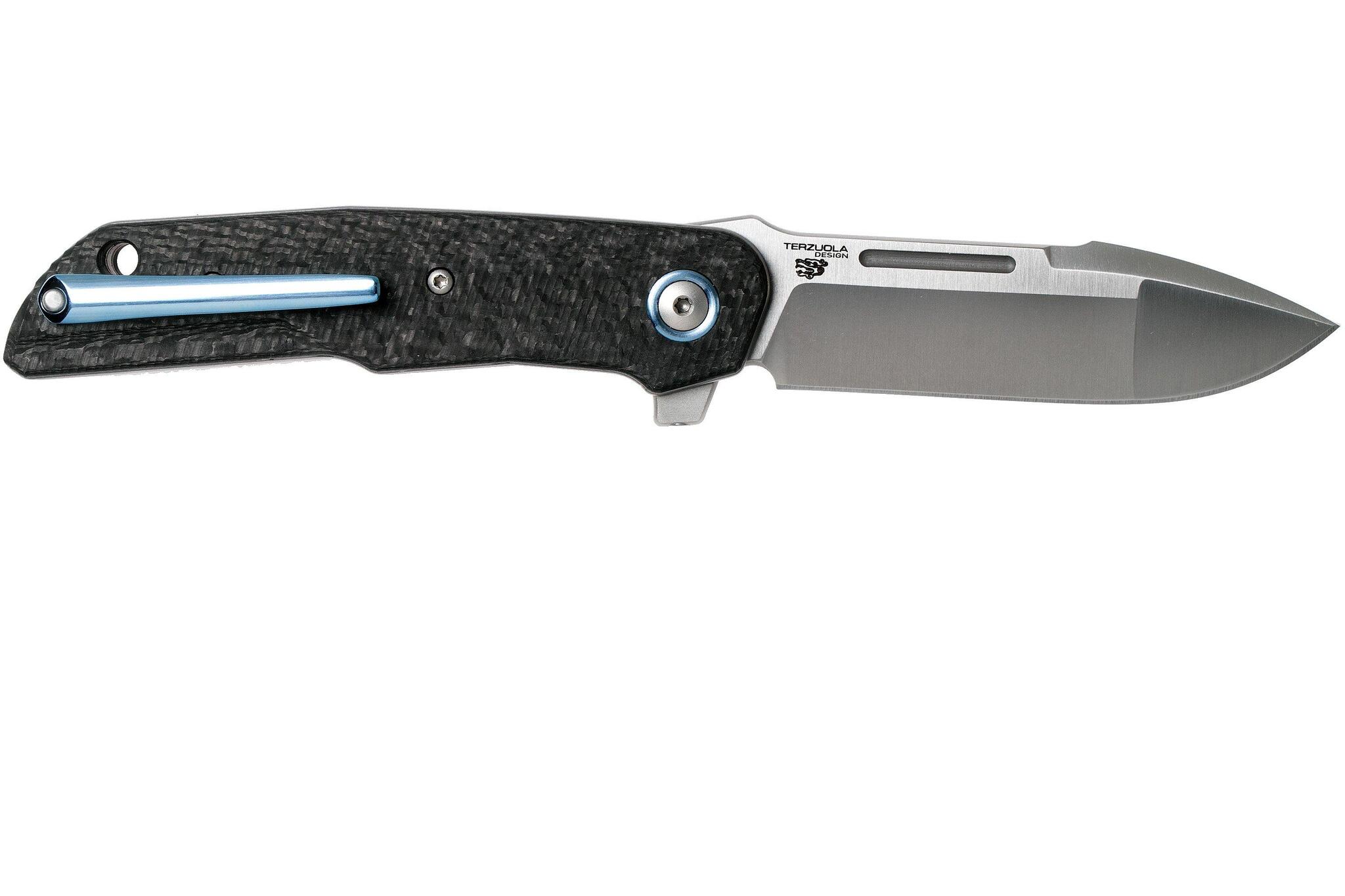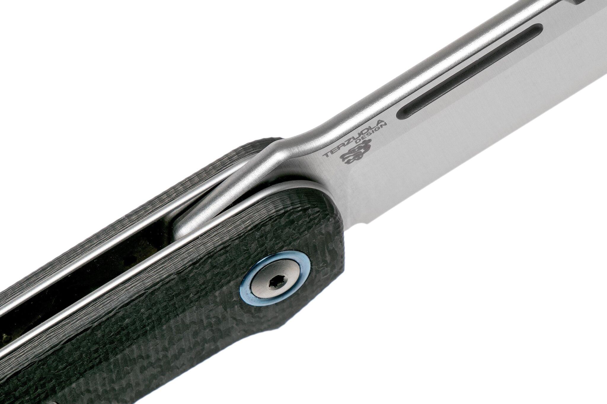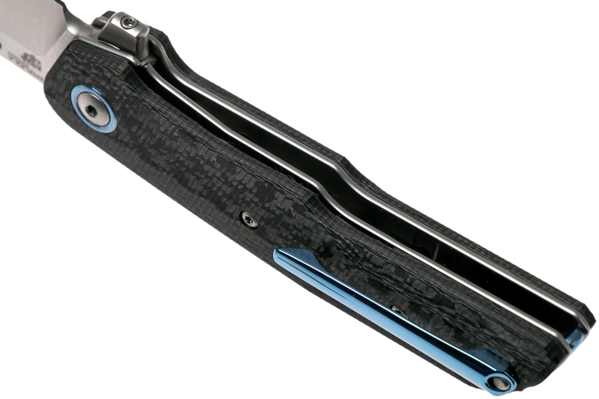 На ноже установлена рукоять из Carbon fiber - нити углерода, залитые смолой в вакууме. Используется как очень прочный и чрезвычайно легкий материал в гоночных болидах. В ножевом мире считается премиум материалом, который также не лишен высоких прочностных характеристик. А различные схемы переплетения тканей углерода придают карбону эстетически разнообразные рисунки. Очевидный минус карбона в его немалой стоимости, которую компенсируют его характеристики и внешняя привлекательность. Carbon fiber не подвержен старению и разрушению от воздействия нагрузок, и больших по значению температур.