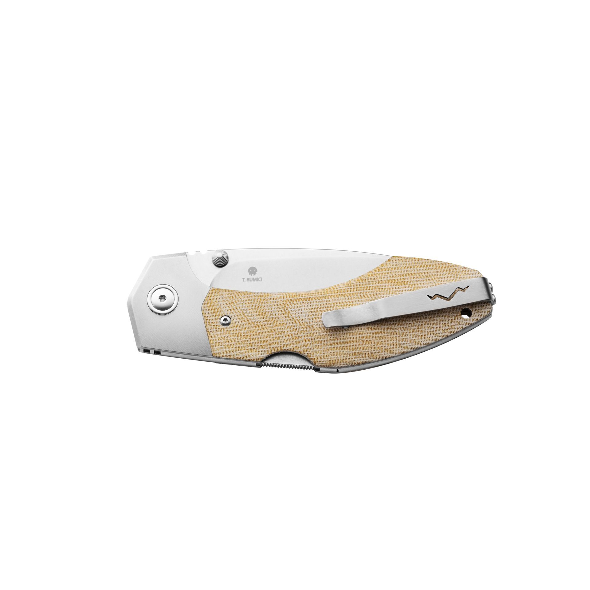Накладки рукояти ножа изготовлены из Микарты - необычный и очень прочный материал. Слой различных тканей (в основном льняных) заливается специальной смолой и под давлением затвердевает - так получается Микарта. Смола, армированная толстым слоем ткани, получается очень прочной и долговечной, такой материал не боится влаги или больших температур. В руке Микарта ощущается, пожалуй, приятнее всех остальных материалов, но некоторым может показаться слегка скользкой. Имеет просто колоссальный выбор цветов и вариаций, что делает Микарту одним из самых интересных материалов для рукоятей ножей.