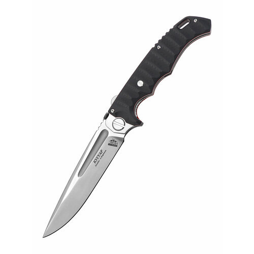 Складной нож Кугуар С Red Нокс «Серии Т» обладает интересным и узнаваемым дизайном, ультимативной надежностью, и высочайшей функциональностью. Осевой узел ножа собран на подшипниках, обработка клинка – сатинирование, сталь D2, твердость 60-61 HRC.Вспомогательный механизм для извлечения клинка, разработанный А.Бирюковым не имеет аналогов в мире. При его помощи клинок мгновенно «вылетает» и нож приводится в рабочее положение.Удобная рукоять с накладками из высокопрочного пластика G10 черного цвета и изящными красными вставками прекрасно смотрится на фоне стального клинка. Трехмерный рельеф поверхности обеспечивают надежный и комфортный хват и цепкое удержание в мокрой руке. Надежный замок гарантирует безопасность работы.Дизайн разработан Александром Бирюковым.
