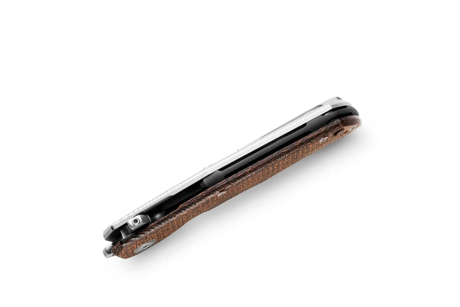 Накладки рукояти ножа изготовлены из Микарты - необычный и очень прочный материал. Слой различных тканей (в основном льняных) заливается специальной смолой и под давлением затвердевает - так получается Микарта. Смола, армированная толстым слоем ткани, получается очень прочной и долговечной, такой материал не боится влаги или больших температур. В руке Микарта ощущается, пожалуй, приятнее всех остальных материалов, но некоторым может показаться слегка скользкой. Имеет просто колоссальный выбор цветов и вариаций, что делает Микарту одним из самых интересных материалов для рукоятей ножей.